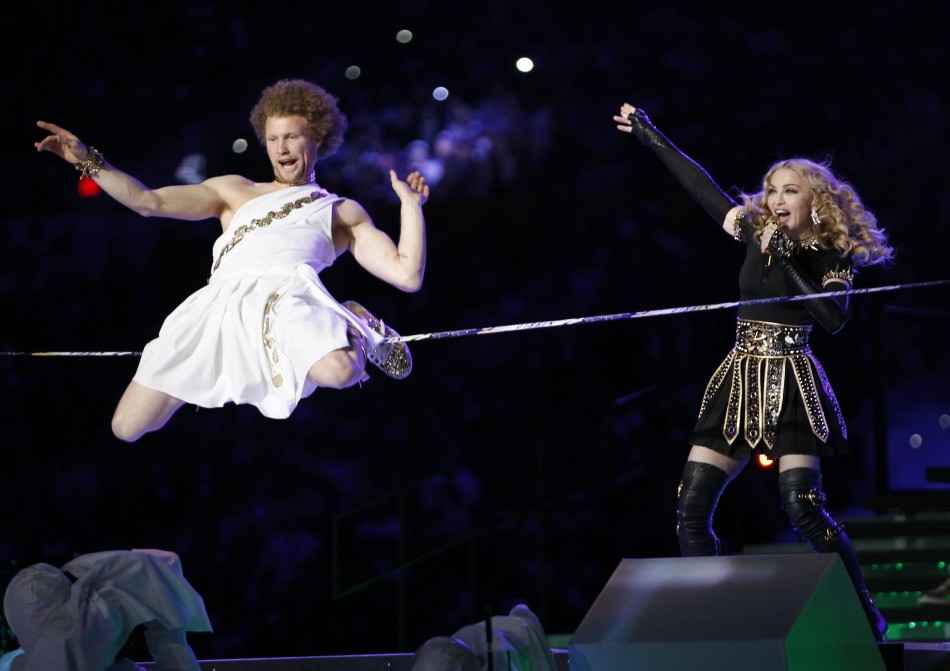 Of course, I am talking about the woman above, Madonna, and she headlined a superbowl halftime show that was perhaps one of the most bedazzling displays of unbridled gaudiness I have ever seen. The pervasive theme was Egyptian queen, I guess, and Madonna, who is 53, played her part well, performing with energy and spunk, and hosting an odd concoction of musician cameos throughout, so much that someone commented that they were just about ready to expect Elton John, who is in a perpetual feud with the blonde Scorpion King, to stroll on stage in bedizened garb to accompany her…instead we got Cee Lo (he is awesome though, so, no complaints).