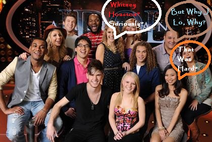 What do the Idol powers at be make our contestants perform on the Top 13 night? Boys: Stevie Wonder. Girls: Whitney Houston. Okay, have fun. Really? How is this fair? You might as well ask them to perform karaoke because most of them inevitably will. This challenge was easier for the boys. Stevie Wonder has an excellent voice and is a true performer, but it is just easier to manipulate his songs. But Whitney Houston? What is the first rule of idol for girls? Never sing Whitney Houston in an audition. Why? She was one of the most powerful female vocalists ever. You are immediately compared with her and you lose that battle all of the time. For the girls, Whitney Houston night just separated the good balladeers from the bad ones. Jessica Sanchez did this: