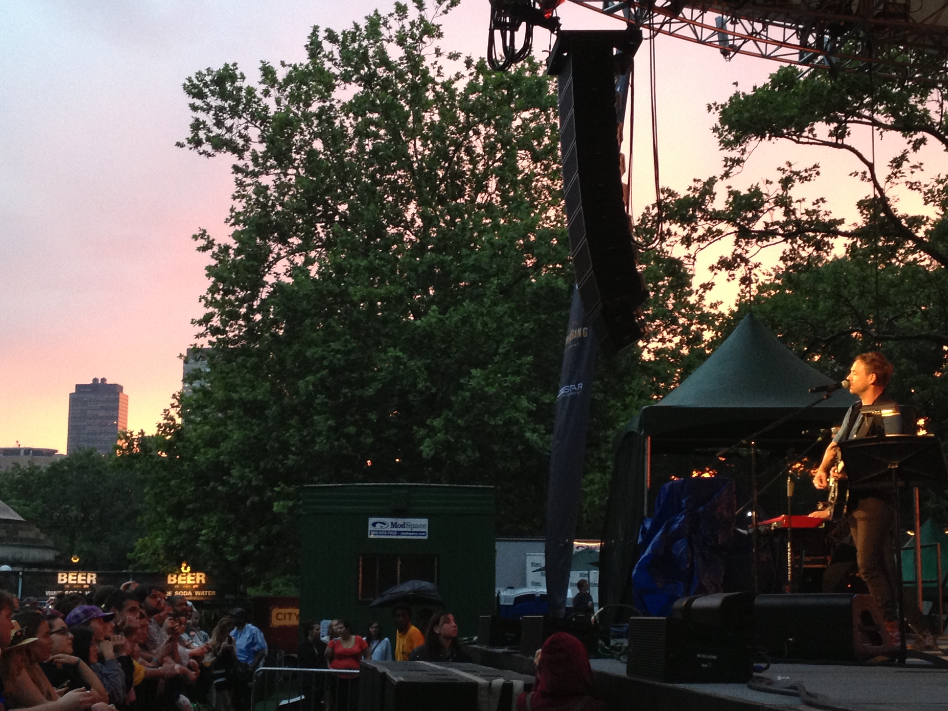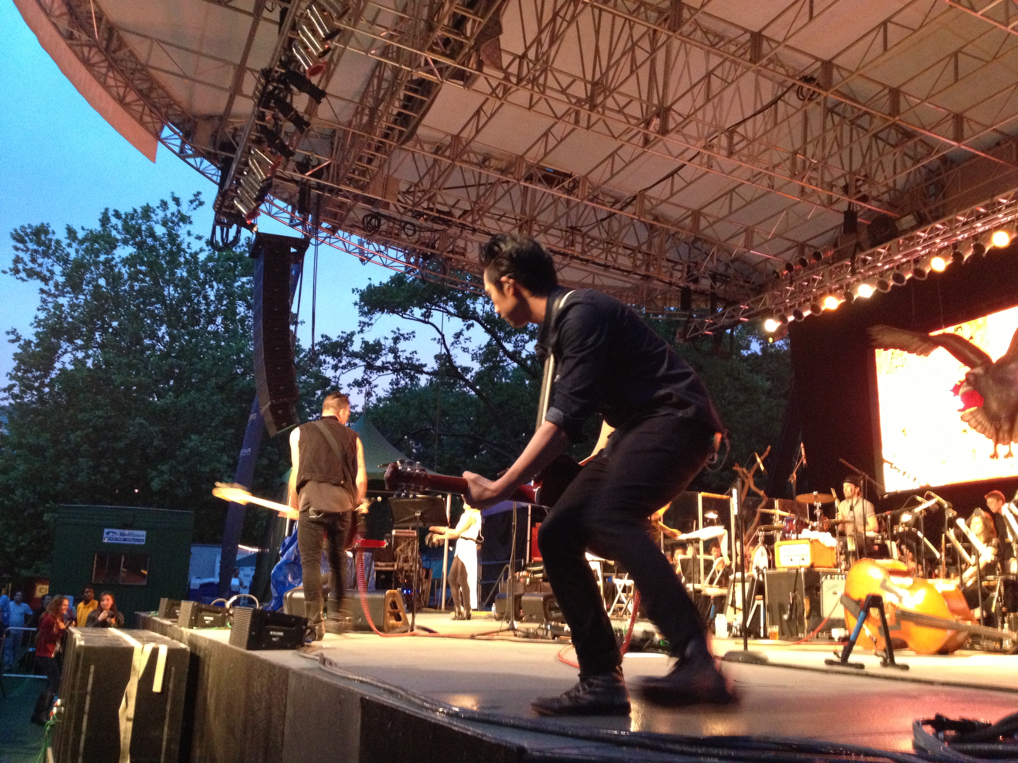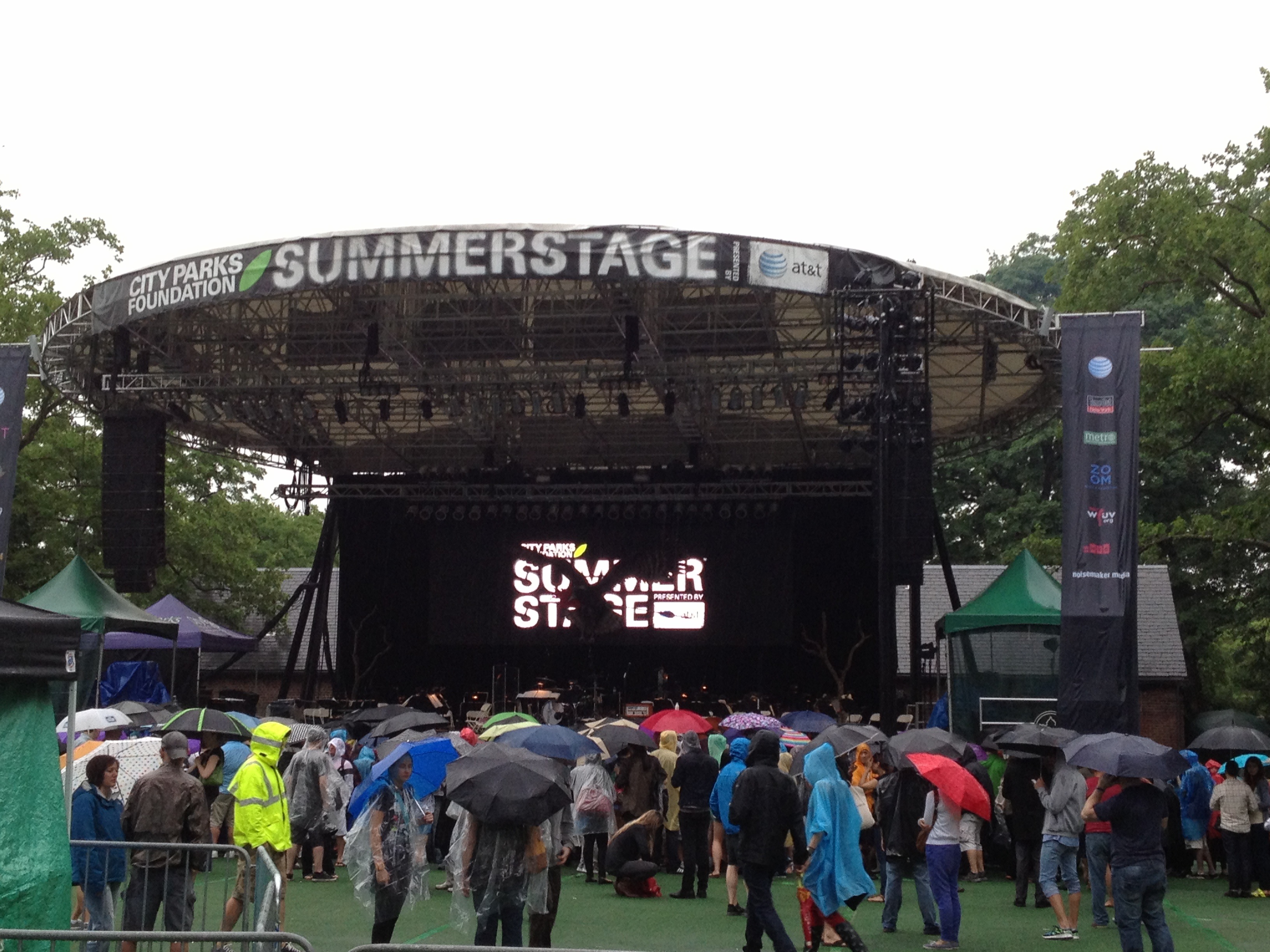 As the above picture suggests, when we arrived to Central Park Summerstage, the weather was less than ideal. A persistent sprinkle fell on umbrellas and Summerstage ponchos. The Calder Quartet, a LA-based string quartet that has become an Airborne Toxic Event staple, opened, and, for the most part, drove the rain away.