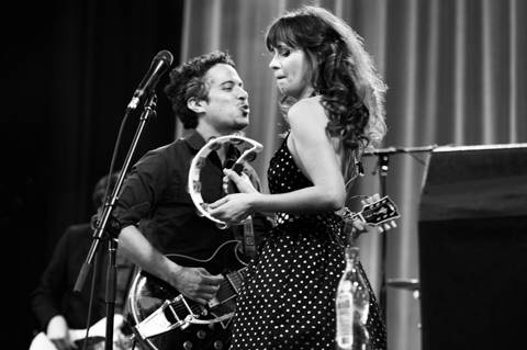 A quick glance at the sold-out crowd at Central Park Summerstage during last Saturday’s scorcher might have suggested something ranging from slightly eerie to downright strange – there was a sea of smiling Zooey Deschanel’s baking in the New York City sun. Draped in diaphanous sun dresses, hair adornments, and soft makeup, a quirky army of fans sat on the faux green lawn of Summerstage and dined on Asiadogs and craft beer through Camera Obscura’s upbeat opening set. And then, as the sun started setting over the skyscrapers in the distance, the one and only new girl fluttered out on stage with her rock partner in crime, M. Ward, and sang “I Was Made for You” to the true sold out crowd of cute impersonators.